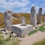 מקדש המצבות בגזר: 8 (או 10) מצבות מונוליטיות מאבן (Stone) בגדלים שונים מ”מקדש במה” ואגן (Basin) אבן (Stone) מרובע מסותת ששימש ככל הנראה למטרות ניקוי או לצורך היקוות דם או נוזלים בהליך דתי. אפשר והמצבות נועדו לסמל לדורות הסכם שנערך בין שבטים (או בין “ערי ממלכה”) בגודל ובחשיבות שונה. מצבות האבן (Stone) נמצאו קבורות בתוך הקרקע (למעט שתיים שראשן היה חשוף), חלקן הפוכות וחלקן קבורות, בחפירות מקאליסטר בתל גזר בתחילת המאה ה-20. גובה חלק מהמצבות עולה על 3 מטרים. לאחר החפירה כוסו המצבות והם נחשפו מחדש עשרות שנים מאוחר יותר. תקופת הברונזה (Bronze) התיכונה 2.