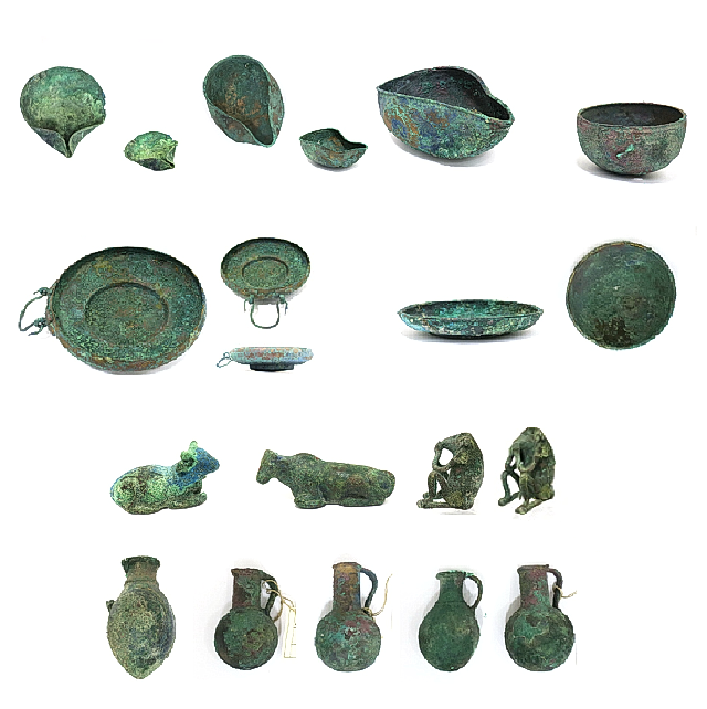 נרות שמן מברונזה (3), קערות ברונזה (3), משקולות בצורת פרים וקוף יושב (3), פכיות ברונזה (5), “מטמון ג’ת”, שךהי תקופת הברונזה המאוחרת תחילת תקופת הברזל