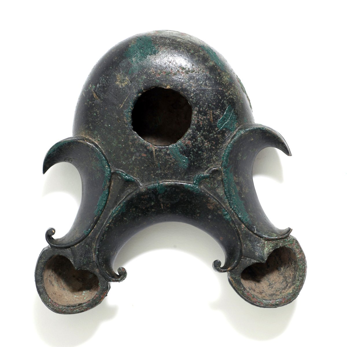 נר שמן מהודר מברונזה עם 2 פיות, התקופה הרומית (מאה ראשונה לספירה)