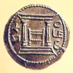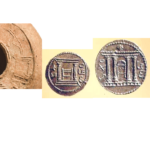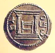 בצילום השני: מטבע סלע מכסף (4 דינר) של מינהלת בר כוכבא (מטבע נדיר ממנו ידועים רק 2 דוגמאות), על גבי המטבע נראה מבנה בית המקדש כבחזיתו 2 עמודים. גג המקדש או או קרניז החזית הינו משופע, צורת העמודים והגג דומים למבנה שעל גבי נר השמן.