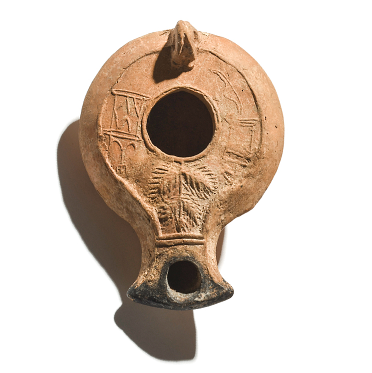 נר שמן מטיפוס דרום, עליו דגם (Model) חזית מקדש ובו מדרגות ו-2 עמודים. מהבניין עולה קטורת, או עשן המסמל שריפה. המבנה דומה בצורתו לצורת בית המקדש המוטבעות על גבי מטבעות מינהלת בר-כוכבא וכן כלי (Vessel) לא מזוהה על גבי רגל גבוהה עם 3 רגליים, ועלים. שלהי המאה הראשונה תחילת המאה השנייה לספירה. התקופה הרומית הקדומה