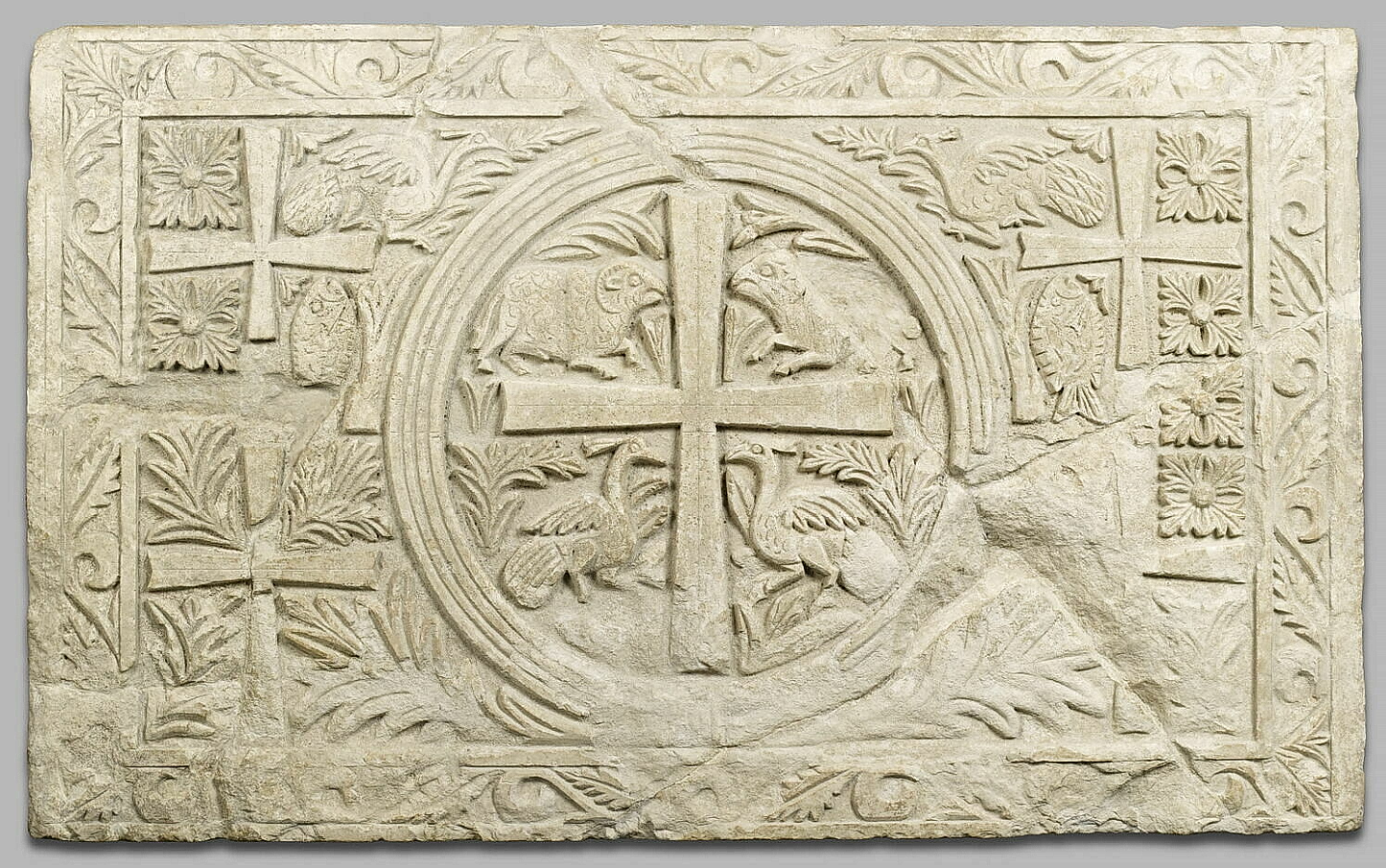 סורג שיש מכנסייה באכזיב, מעוטרת בבעלי חיים (ציפורים, דגים) וצלב. התקופה הביזנטית