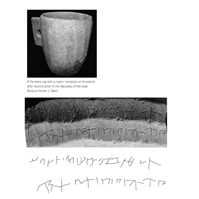 ספל אבן עם כתובת. הכתובת קשה לפענוח ויתכן והיא קשורה לתפקוד הכלי או לפסוק בעל ערך דתי. חפירות הר ציון. התקופה הרומית המוקדמת
