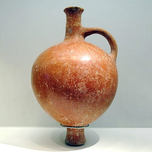 פך, גוף כדורי, ממורק אדום, ברונזה (Bronze) קדומה ג' כלי דומה נתגלה בחפירות יריחו מוזיאון ישראל
