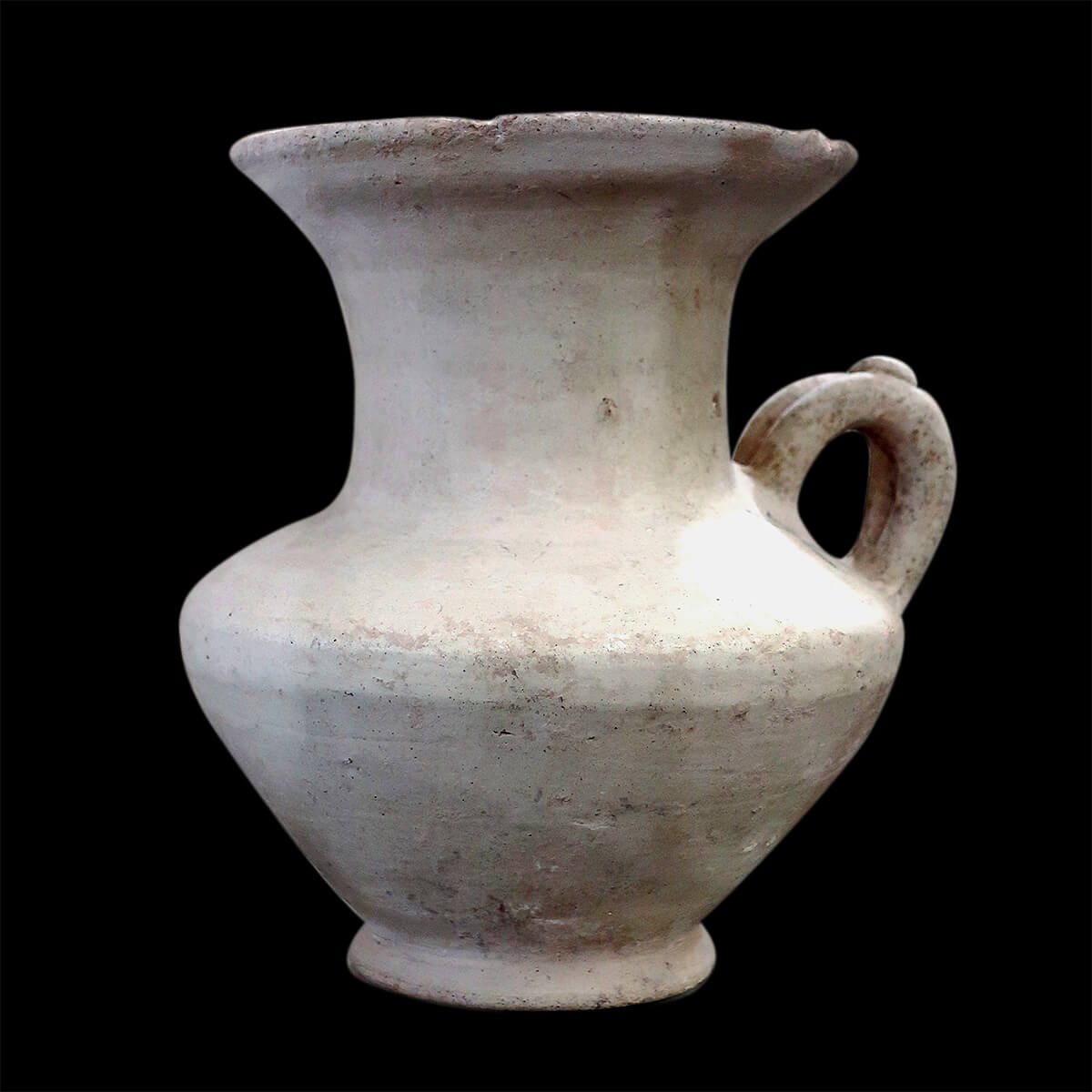 פך מזווה עם צוואר רחב במיוחד וידית (Handle) כתף (ככל הנראה ייצור מקומי מושפע מסגנונות מעורבים מצרים וכנענים). תל אל עג’ול. שלהי תקופת הברונזה (Bronze) התיכונה תחילת תקופת הברונזה (Bronze) המאוחרת