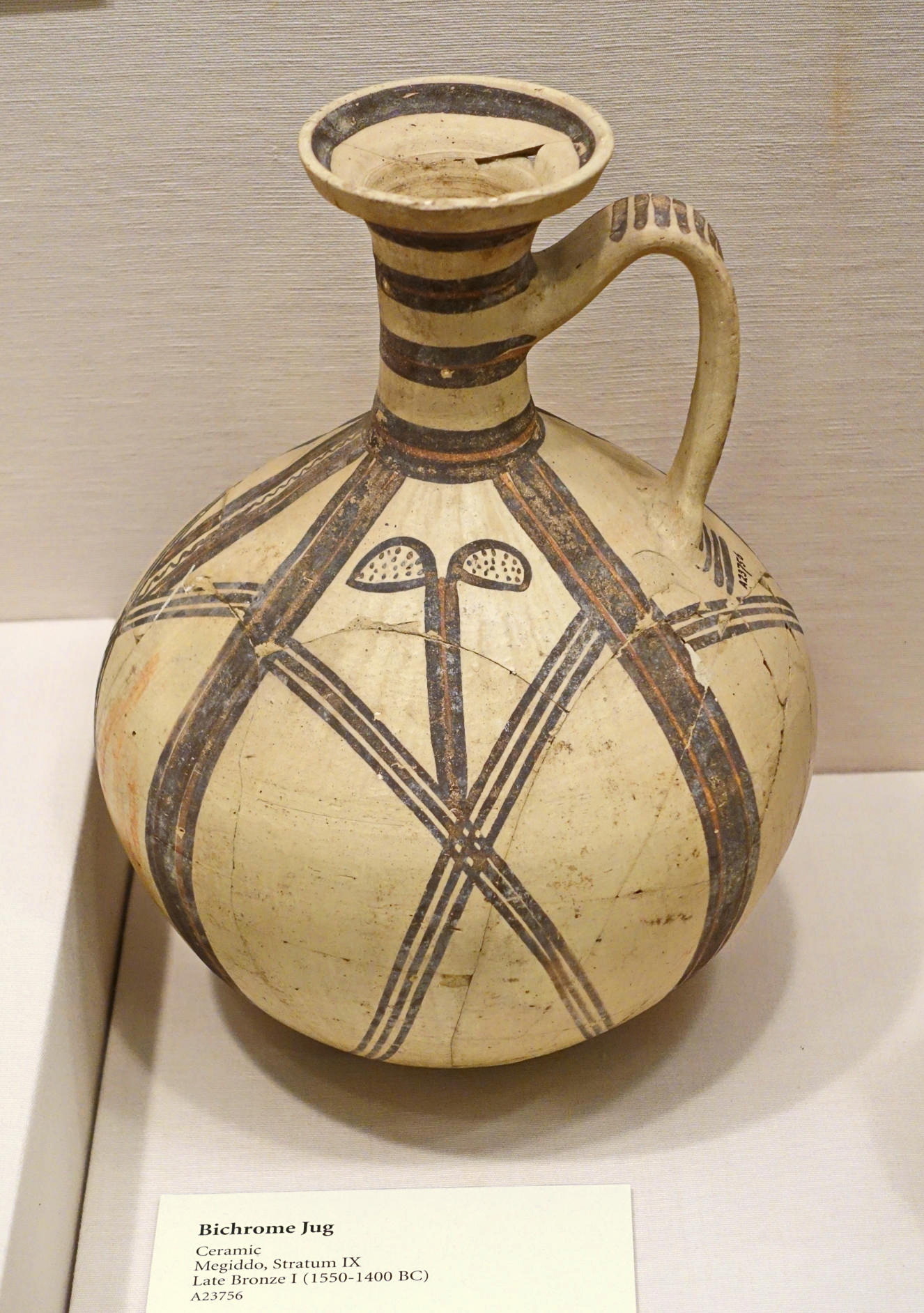 פך, מעוטר בסגנון בי-כרומו (שחור-אדום). יוצר במקור בקפריסין. תל מגידו. תקופת הברונזה התיכונה 2-ברונזה מאוחרת