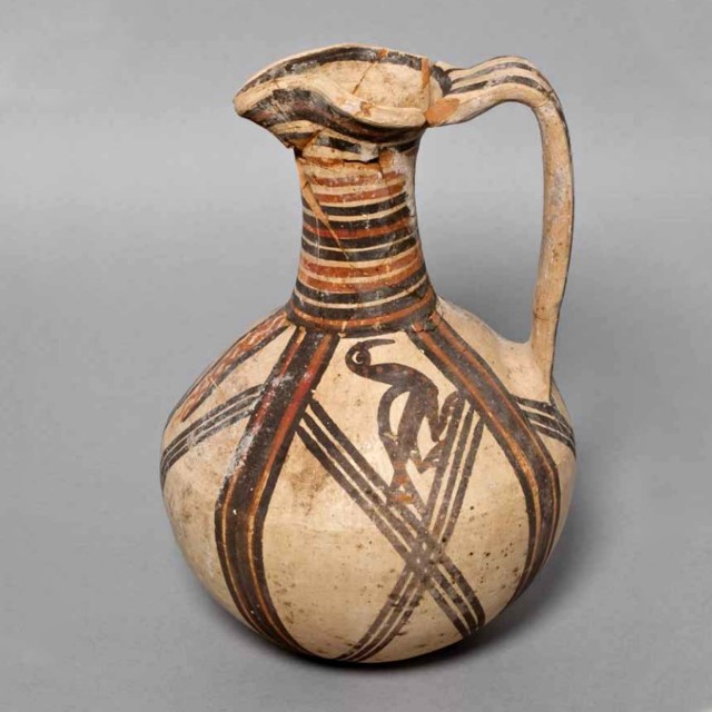 פך מעוטר בציפור בסגנון בי-כרומו, יבוא קדום מקפריסין, תל מגידו, תקופת הברונזה המאוחרת