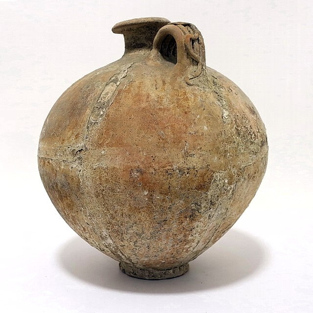 פך, עם נחש על הידית (Handle) [זואומורפי] וסימני מנשא מעור שהחזיק את הכלי (Vessel). תקופת הברונזה (Bronze) התיכונה 2