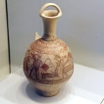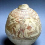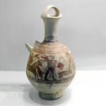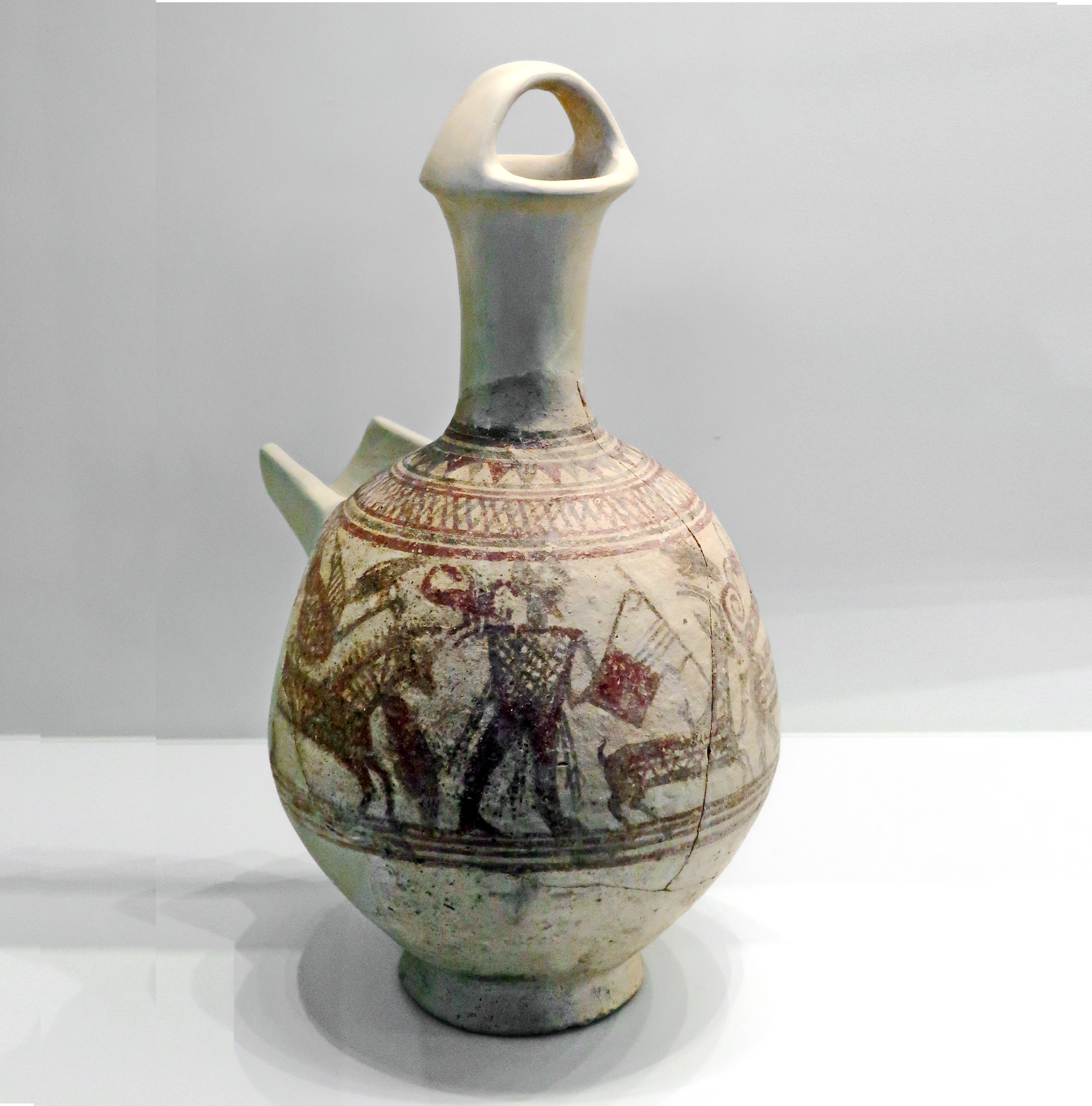 פך, עם עיטור מנגן בנבל, צבי ובעלי (Pestle) חיים נוספים, סגנון פלישתי או קרוב אליו, תל מגידו, תקופת הברזל 1