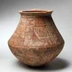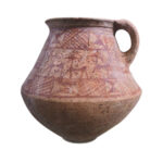 פך “פתוח” מזווה עם עיטורי בעלי (Pestle) חיים: 3 איילות, אייל עצמאי ועוד בגוון אדום. תל פרעה דרום (שרוחן). תקופת הברונזה (Bronze) המאוחרת