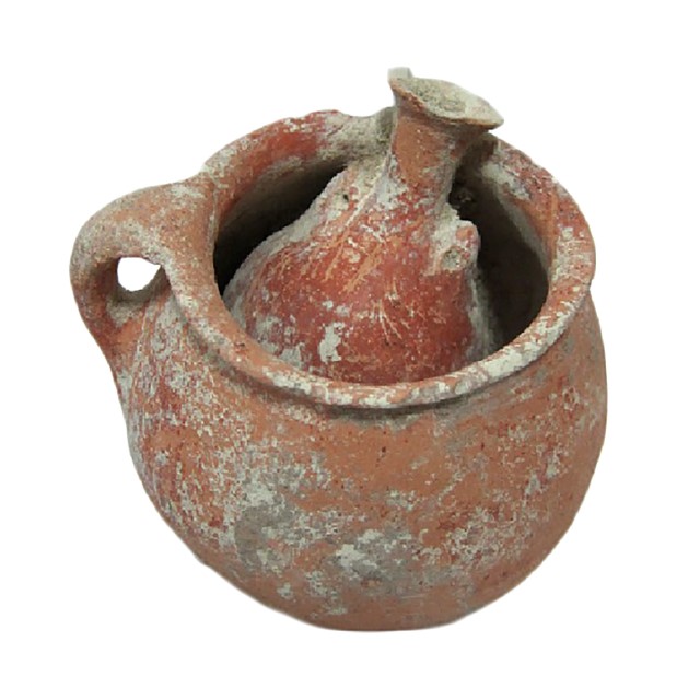 פך פתוח מחופה, עם קנקנית בתוכו (“נדבקה” במערת הקבורה), ברונזה קדומה ב’
