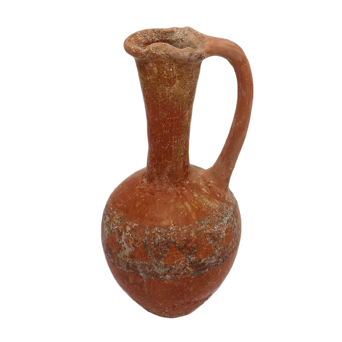 פך, צוואר מאורך, אדום, מעוטר בקווים שחורים, שפה תלתנית, תקופת הברזל 2