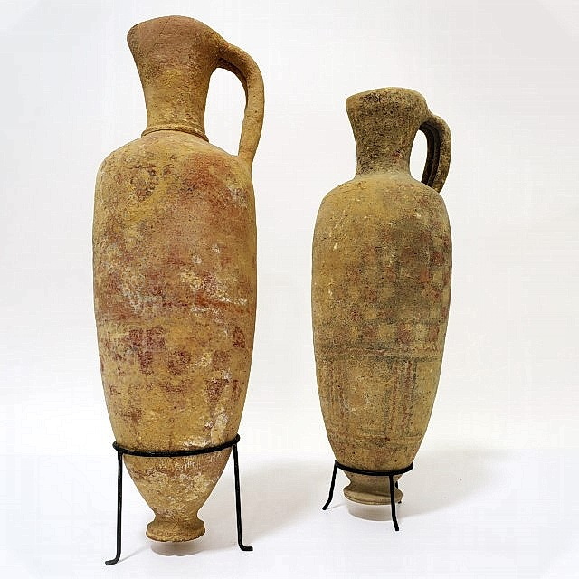 פכים גדולים (2) מעוטרים בצבע (ריבועים) כנראה לפני שריפה, על רגל, תקופת הברונזה התיכונה 2