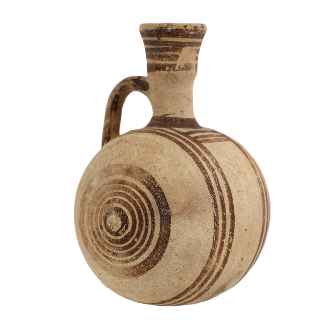 פכית "חבית", מעוטרת בשחור על לבן, יבוא קדום מקפריסין, תקופת הברזל 1-2