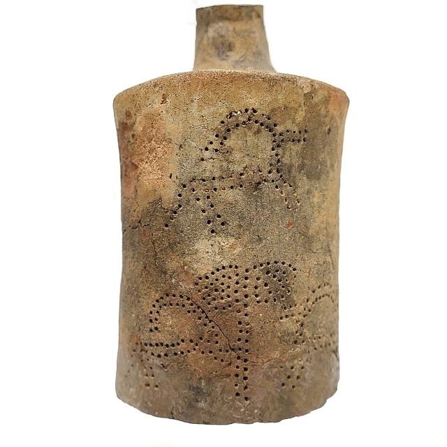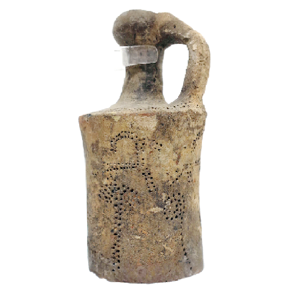 פכית, מעוטרת בדיקור באיילים בסגנון “תל אל יהודיה” [זואומורפי]. גוף “חבית” (גלילי). תקופת הברונזה התיכונה 2