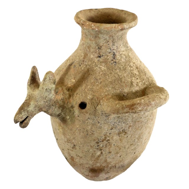 פכית עם זרבובית בצורת בעל חיים וחור מקורי בצידה. תקופת הברונזה (Bronze) המאוחרת.