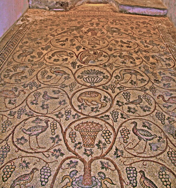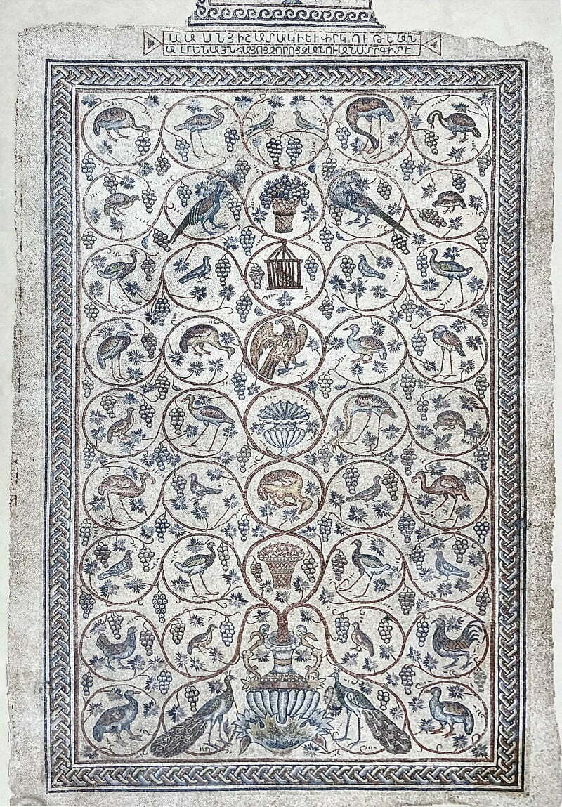 פסיפס הציפורים. הכנסייה הארמנית בירושלים (ליד שער שכם). נתגלה ב-1894. בפסיפס 43 מדליונים, מרביתם הגדול עם עם ציפורים וכן אגרטל. המאה השישית לספירה. התקופה הביזנטית