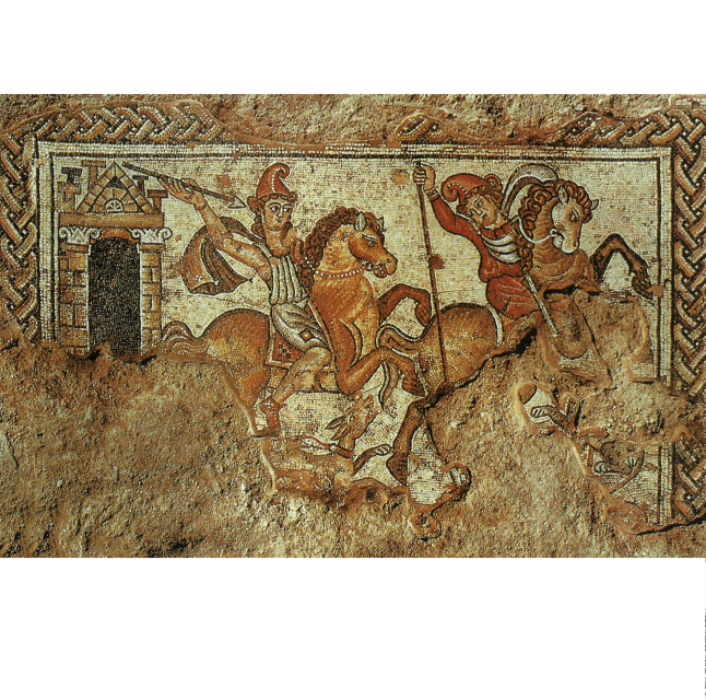 אמזונות וסוסים מתוארים בפסיפס באחד מחדרי האגף המזרחי של “בית חג הנילוס” בציפורי. המאה השישית לספירה. התקופה הביזנטית
