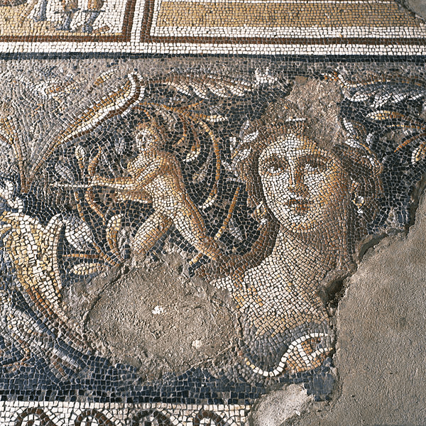 אמזונות וסוסים מתוארים בפסיפס באחד מחדרי האגף המזרחי של בית "חג הנילוס" בציפורי. המאה השישית לספירה. התקופה הביזנטית