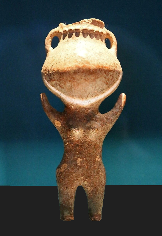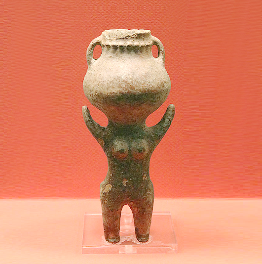 כלי-פסלון של אשה כשראשה בצורת כד וידיה מונפות כלפי מעלה (כלי אנתרופומורפי). באב א דרע (עבר הירדן, ממזרח ללשון ים המלח). תקופת הברונזה הקדומה 1 (המוזיאון הארכיאולוגי רבת עמון)