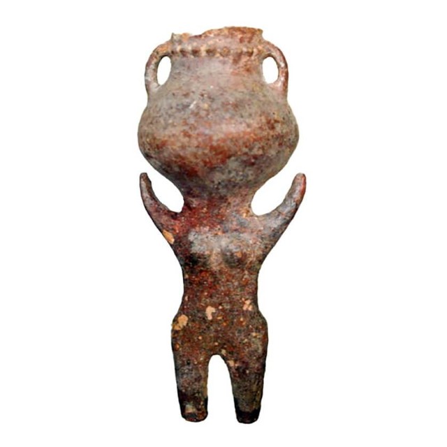 כלי-פסלון של אשה כשראשה בצורת כד (כלי אנתרופומורפי). באב א דרע (עבר הירדן, ממזרח ללשון ים המלח). תקופת הברונזה הקדומה 1 (המוזיאון הארכיאולוגי רבת עמון).