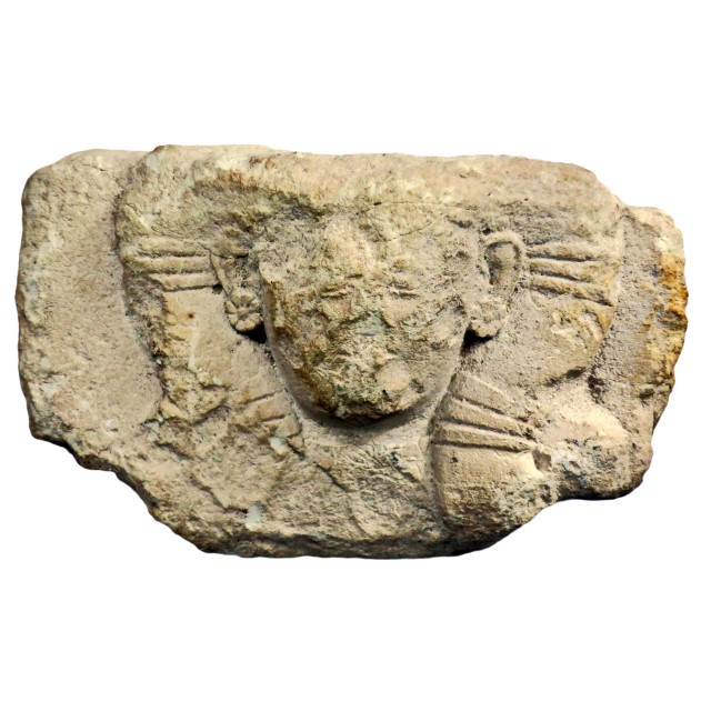 פסל אבן גיר, עמוני של אשה עם תסרוקת חתחור, עם עגילים בצורת פרח (דומים לאלו שבפסלים עמונים וסוריים), תקופת הברזל 2 לדוגמת העגילים בצורת פרח עלים ראה פסל עמוני מאוסף דיין (כיום במוזיאון ישראל)