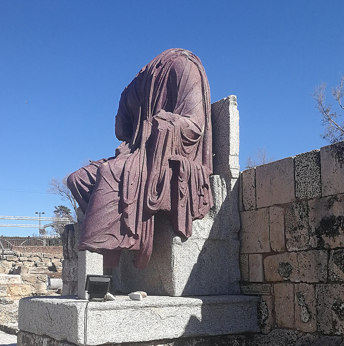 פסל שיש של אדריאנוס (הדריאן), ללא ראש. קיסריה. המחצית הראשונה של המאה השניה לספירה. התקופה הרומית הקדומה