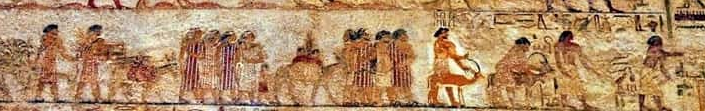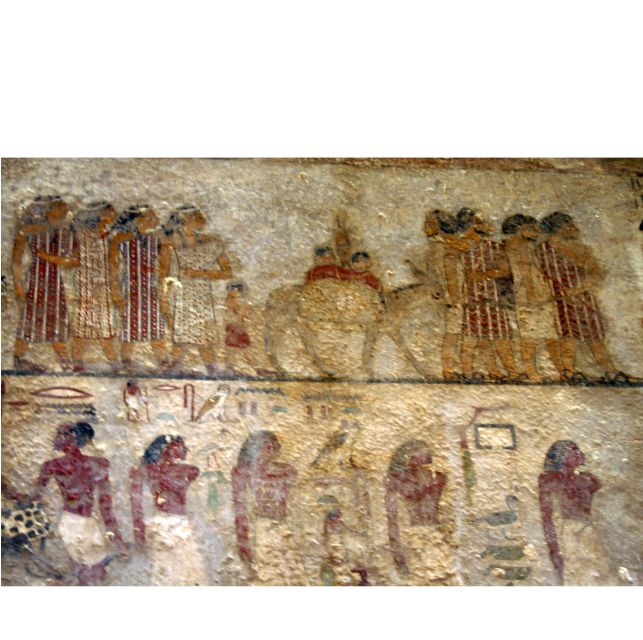 ציור קיר מקבר בבני-חסאן (לערך באמצע הדרך בין קאהיר ללוקסור, לא הרחק מהעיר מיניה, במדבר שממזרח לנהר הנילוס). בציור נראית משפחה כנענית המונה 15 אנשים, בהם גברים (בעלי זקן), 4 נשים, 3 ילדים, חמור ואיילים. מרביתם לבושים בכותנות פסים מהודרות. הקבוצה השמית מכונה "עאמו" (Aamu) והינם מוגדרים כהיקסוסים. בראשם אדם בשם "אבשה". הקבוצה מתוארת במחקרים ובספרות כקבוצת סוחרים המביאים איתם מנחות ואולם אפשר והיא מתארת משפחה שמית שירדה למצרים. השושלת ה-12, שנת 1900 לפנה"ס לערך. תקופת הברונזה התיכונה.