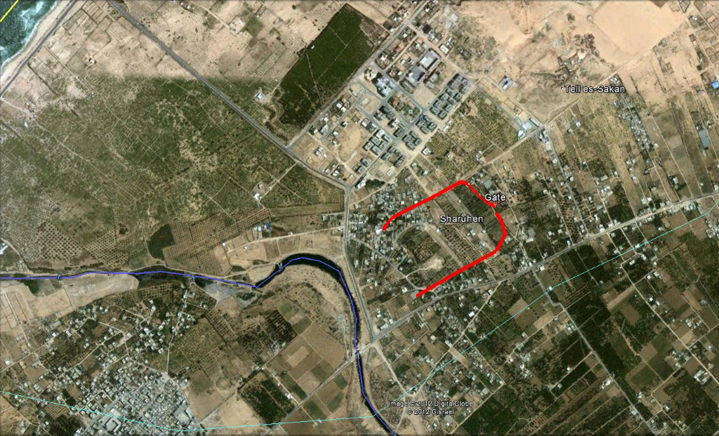 צילום אוויר של תל אל עג’ול, דרומית לעיר עזה, בקרבת נחל בשור. סיר פיטרי העריך כי במקום זה שכנה עזה הקדומה בתקופת הברונזה התיכונה והמאוחרת. צפון-מזרח לו תל סקאן.