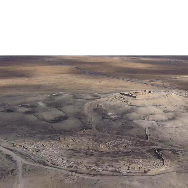 צילום אוויר של תל ערד. בחלק התחתון של הצילום ניתן להבחין בחומת העיר ובבנייני העיר מתקופת הברונזה הקדומה א' וב' (ניתן לראות את מגדלי השמירה המעוגלים). בחלק הימני העליון: המצודה מתקופת הברזל/התקופה הפרסית ומהתקופה ההלניסטית