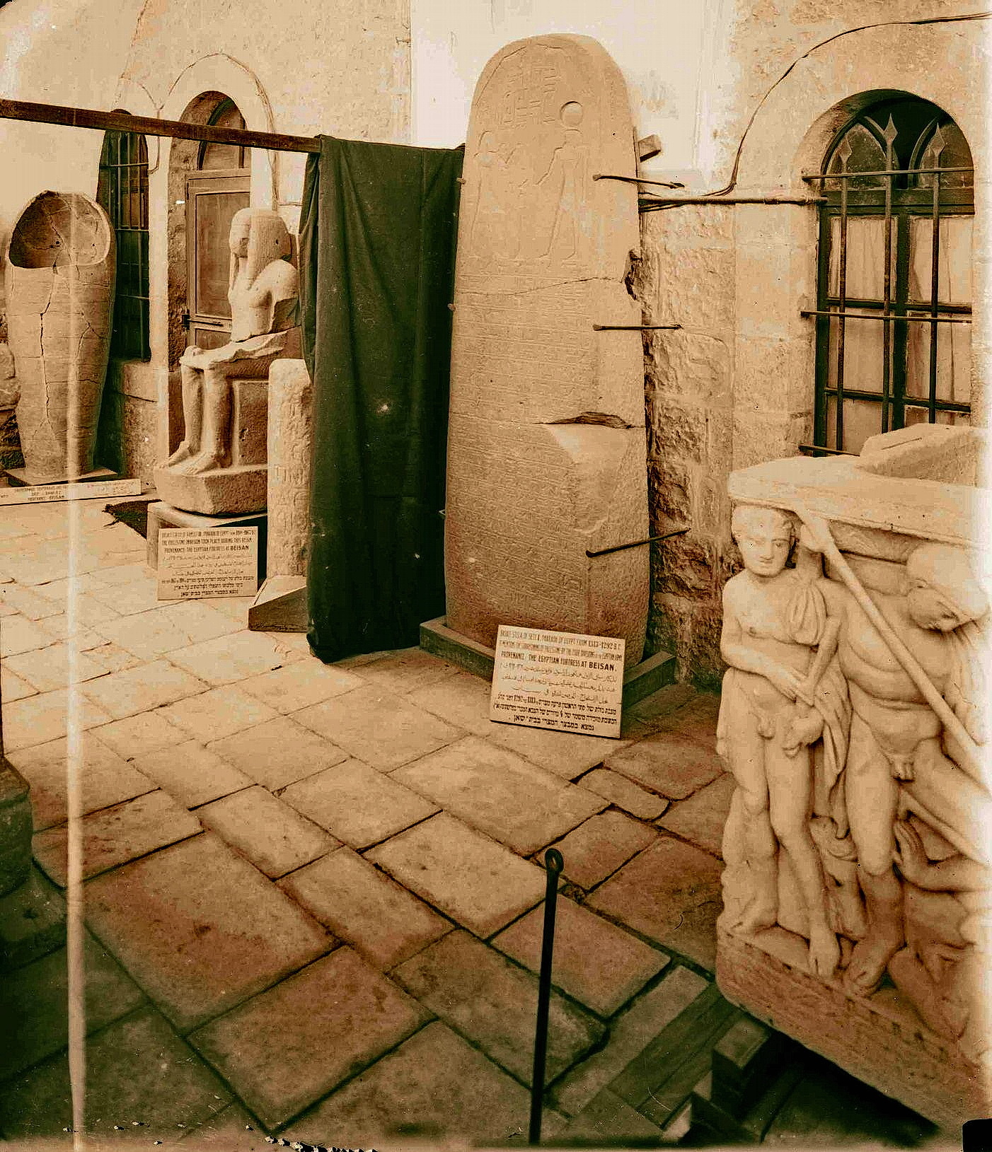 צילום חצר המוזיאון הארכיאולוגי של פלסטינה-ארץ ישראל בירושלים, לפני הקמת מוזיאון רוקפלר. מימין לשמאל: סרקופג מתל מבורך (ליד קיסריה), אסטלה, פסל רעמסס השלישי ואנתרופואיד מחפירות בית שאן.