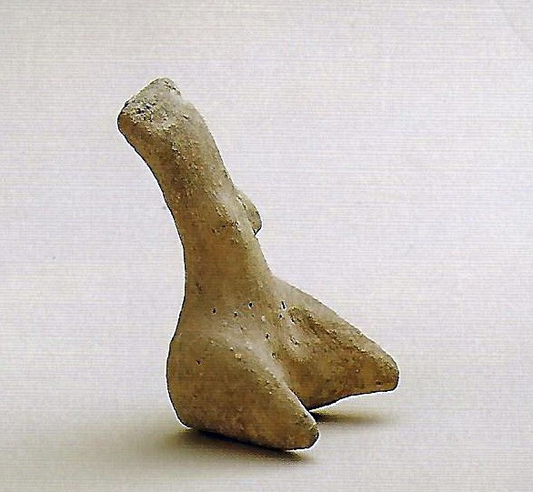 צלמית אשה יושבת. נתיב הגדוד (ליד יריחו). עשויה מטין. התקופה הניאוליתית הקדם קראמית א (כ-9000 לפנה”ס)
