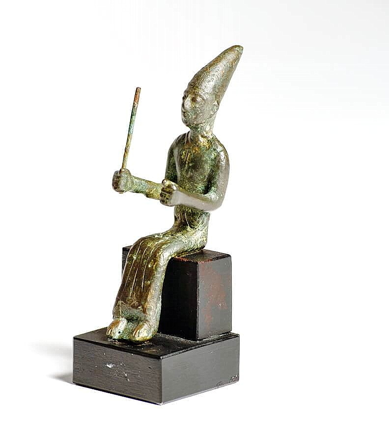 צלמית ברונזה של אל יושב המחזיק בידו מקל (מטה, שרביט או טס ללא ראש). תקופת הברונזה המאוחרת