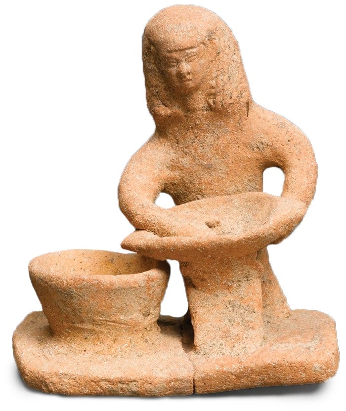 צלמית חרס פיניקית של אשה כותשת (או מכינה) מזון. תל אכזיב. מאוסף פרטי, נרכש בשנת 1889 ע"י מוזיאו הלובר (פריז). תקופת הברזל 2