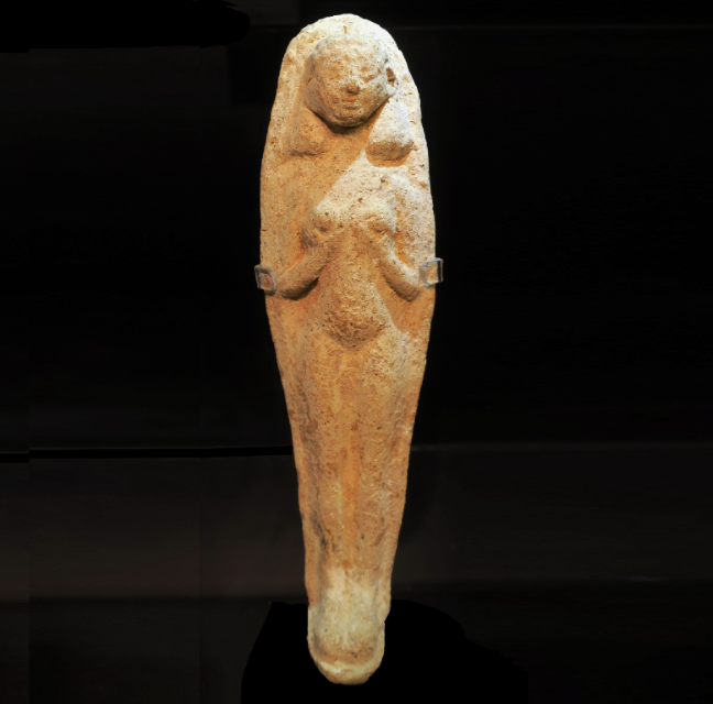 צלמית-לוחית של אשה עירומה התומכת את שדיה ב-2 ידיה. רגליה פונות לחזית ונתמכות בידי מסד. הלוחית (Slab) נוצרה בתבנית (Mould). מושפעת בצורתה מצלמיות מטיםוס האשה במיטה.תקופת הברונזה (Bronze) המאוחרת
