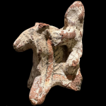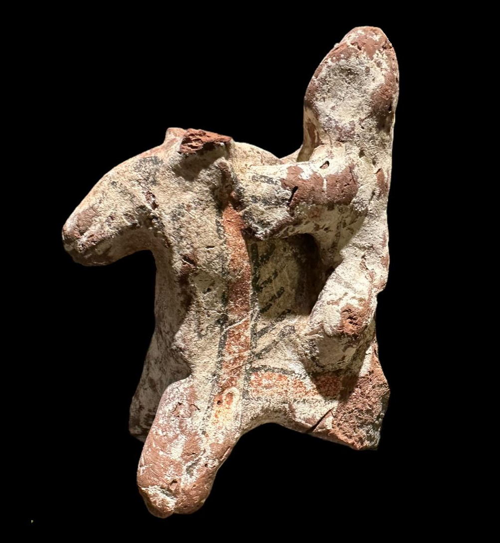 צלמית סוס ופרש מחופש בגיר לבן וצבוע באדום-שחור. ככל הנראה מירדן (מזרחית לעמאן). תקופת הברזל 2