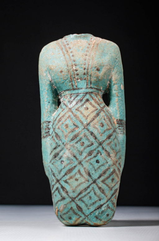 צלמית עשוייה פאיינס ירוק. במקור ממצרים. לדמות שמלה מהודרת וכתפיות. כנראה מתקופת הברונזה התיכונה 2