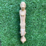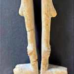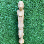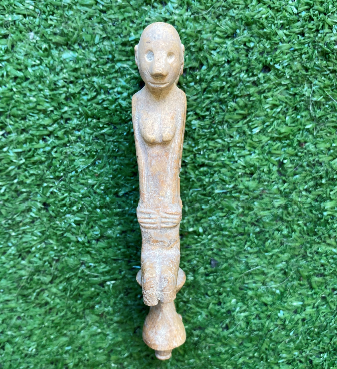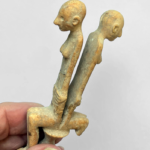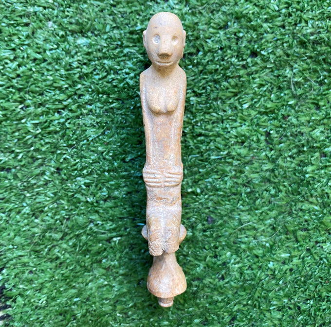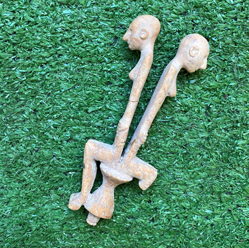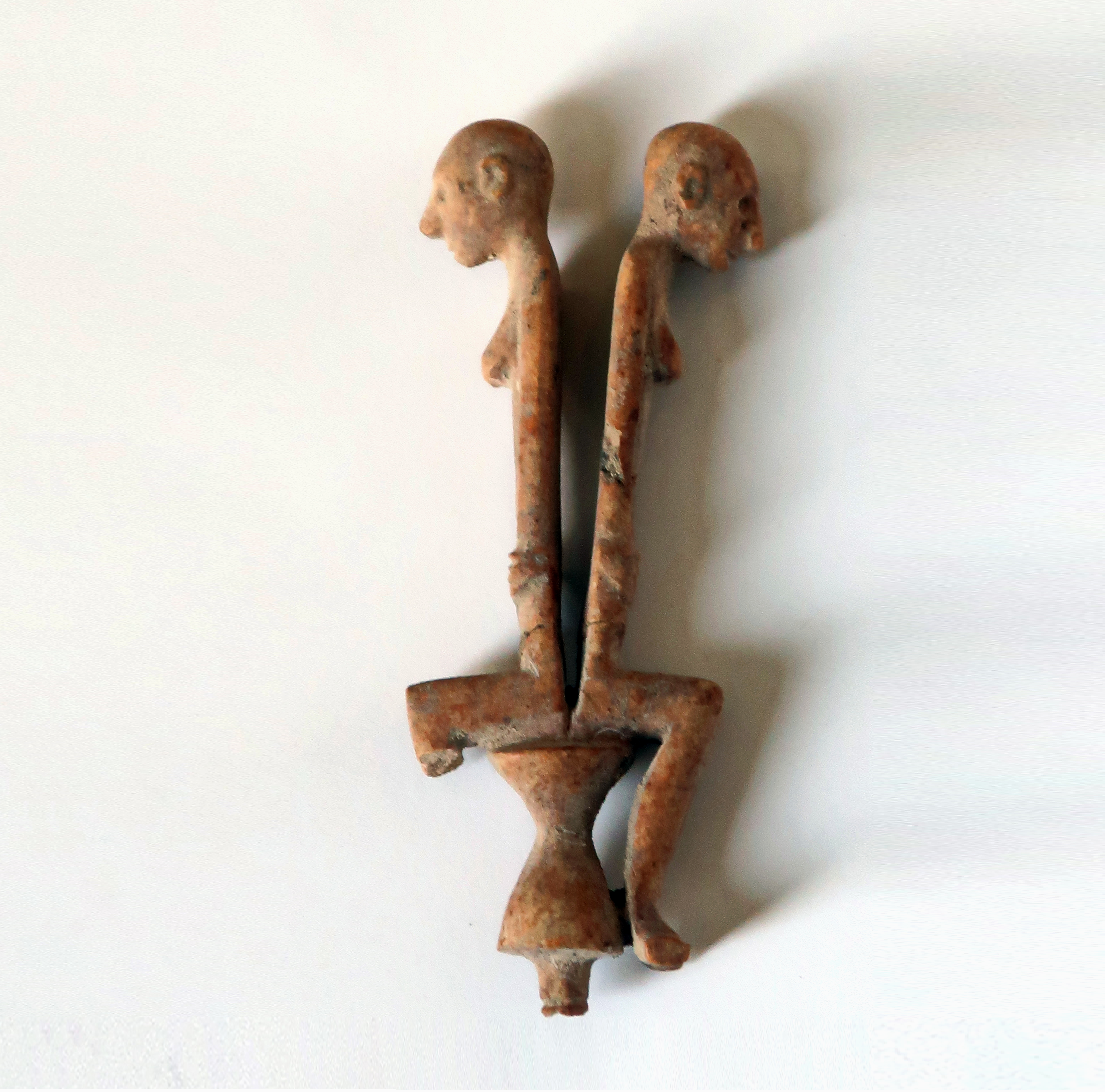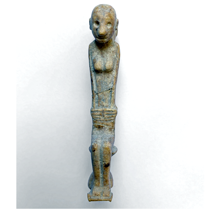 צלמית (פסלון) של 2 נשים יושבות על שרפרף “גב אל גב”. עשוי שנהב (כ-10.5 ס”מ). החפץ שובץ כנראה בראש מוט עץ או שנהב (“נס”). צורת ראשי הדמויות מזכיר צלמית (Figurine) ראש מבזלת משקמים וכן ראש המעטר גלוסקמא מפקיעין.התקופה הכלקוליתית המאוחרת