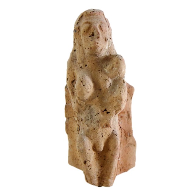 צלמית של אנדרוגינוס (חצי גבר חצי אשה), מדגם מקדש. הדמות מחזיקה ככל הנראה בידיה תינוק. עבר הירדן (מואבי?). תקופת הברזל 2 (מאות 9-10 לפנה”ס)