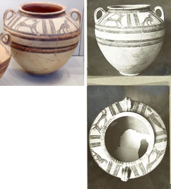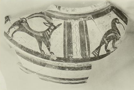 קדרה מעוטרת בסגנון בי-כרומו, עם בע”ח (ציפור, איילה), יבוא (קדום) מקפריסין. תל לכיש (חפירות סטרקי). תקופת הברונזה המאוחרת