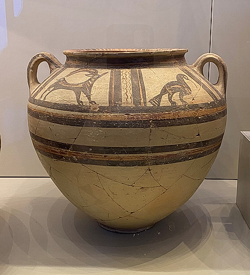 קדרה מעוטרת בסגנון בי-כרומו, עם בע"ח (ציפור, איילה), יבוא (קדום) מקפריסין, לכיש, תקופת הברונזה המאוחרת.