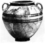 קדרה מעוטרת בציפורים ובקווים. עיטור בי-כרומו (דו-גוני אדום-שחור). תל אל עג'ול. תקופת הברונזה (Bronze) המאוחרת