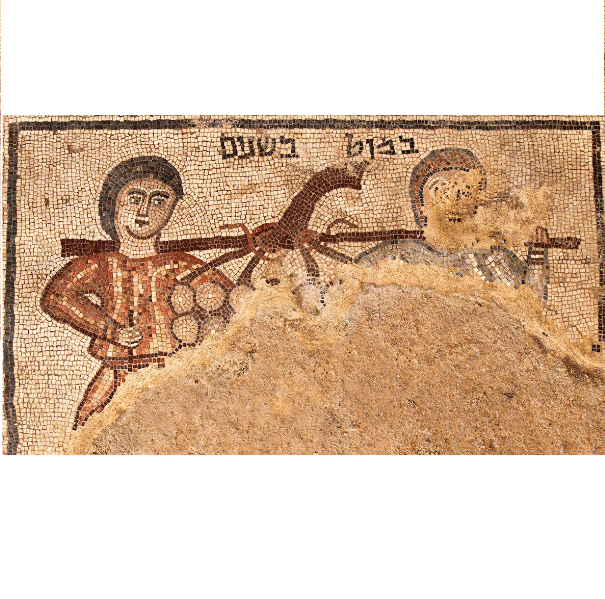 קטע מרצפת הפסיפס של בית הכנסת בחוקוק “וישאו במוט בשניים” (המרגלים). התקופה הביזנטית