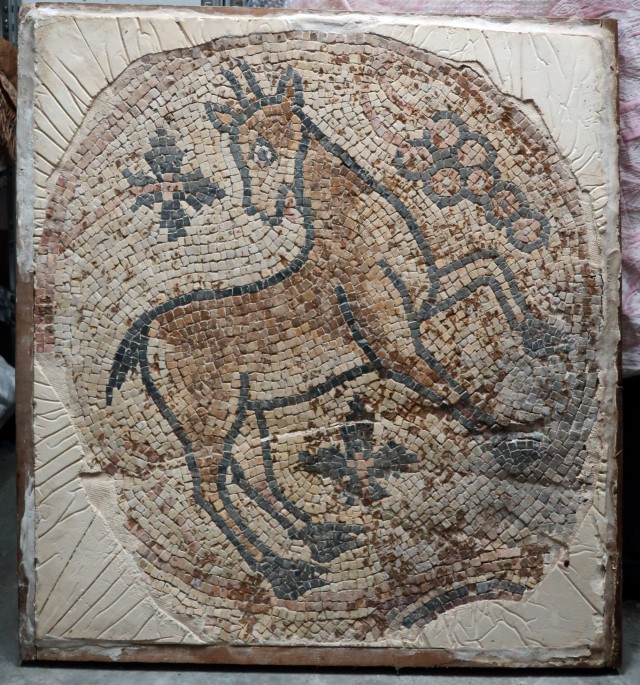 קטע פסיפס מעוטר באיילה, כנראה מכנסיה מהמאה השישית לספירה. התקופה הביזנטית