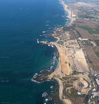 קיסריה – צילום אוויר של הנמל שהקים הורדוס (מהאוויר מכיוון מזרח למערב) ותרשים שחזור הנמל בימי הורדוס