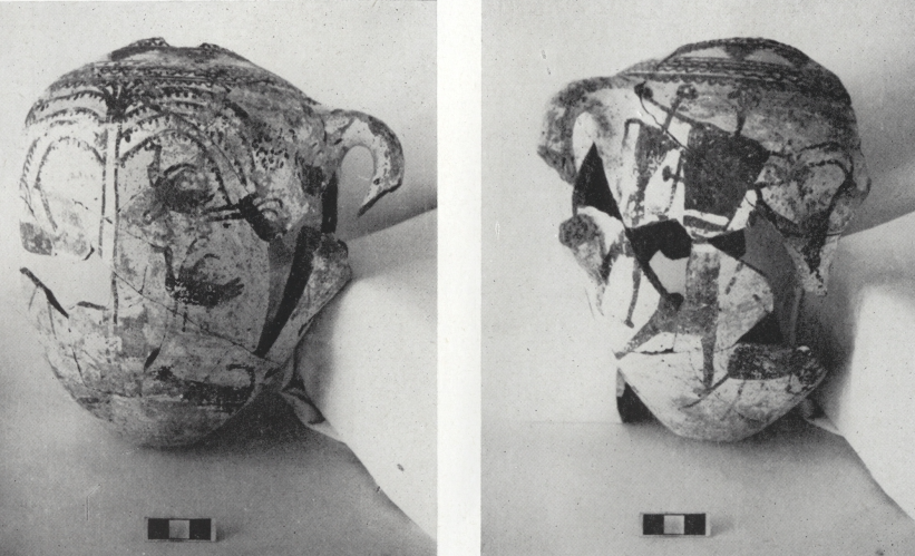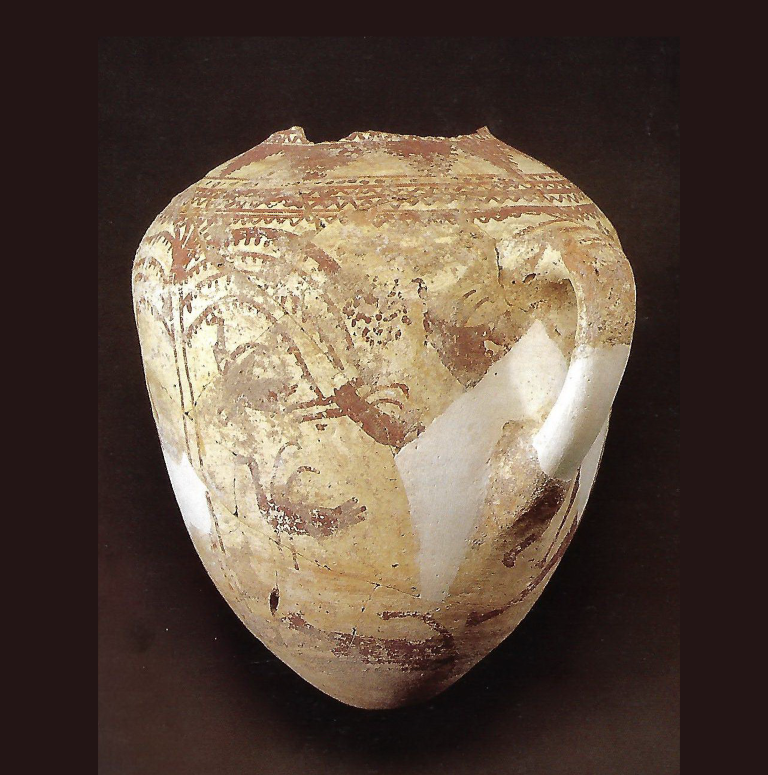 קנקן מעוטר בסגנון שוקולד-על-חלב בציור איילות ודמויות אנשים. תל פרעה צפון. תקופת הברונזה המאוחרת I