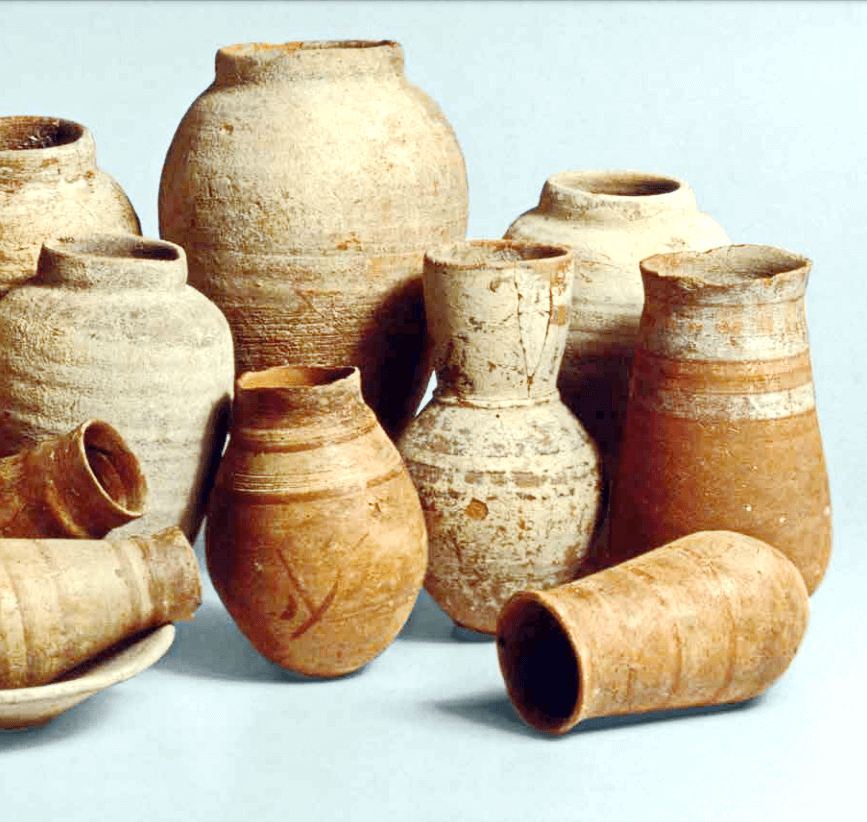 קנקנים עם בסיס בצורת “חרוט”, יבוא קדום ממצרים או ייצור מקומי בסגנון מצרי. דיר אל באלח (רצועת עזה). תקופת הברונזה (Bronze) המאוחרת