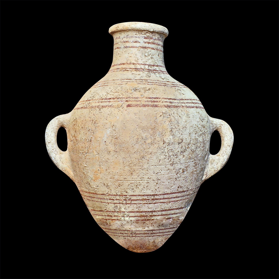 קנקנית, מחופה בתכסית בגוון לבן. מעוטרת בפסים בגוון חום בסגנון המכונה “שוקולד על לבן”. שלהי תקופת הברונזה התיכונה – תחילת תקופת הברונזה המאוחרת.