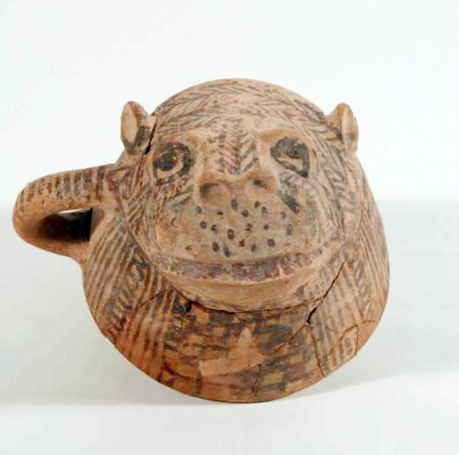 קערה עם ידית (Handle) עם דמות לביאה בתחתית, פלישתית, ממקדש בנחל פטיש (Hammer) (נגב צפוני), תקופת הברזל 1