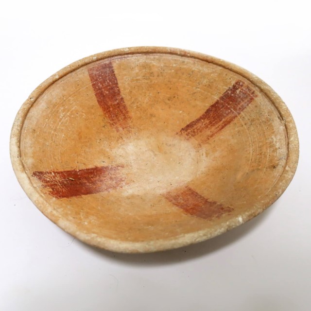 קערה שטוחה, עם עיטור X באדום, תקופת הברונזה התיכונה 2 לקערה עם עיטור דומה: ראה ממצאים מקבר מנמל תל-אביב, חפירות ד"ר יעקב קפלן